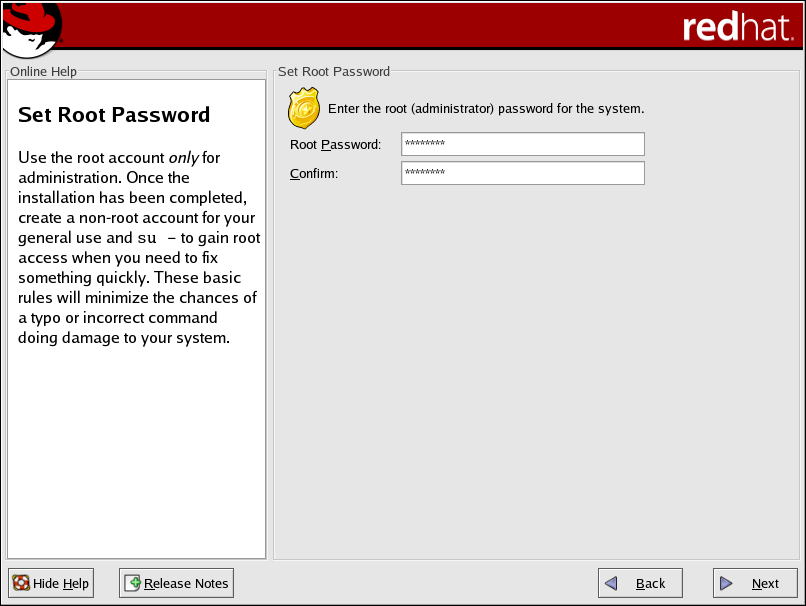 | [1] | A root password is the administrative password for your Red Hat Enterprise Linux system. You should only log in as root when needed for system maintenance. The root account does not operate within the restrictions placed on normal user accounts, so changes made as root can have implications for your entire system. |