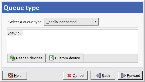After clicking Forward, Figure 36-4 appears. Select Locally-connected from the Select a queue type menu, and select the device. The device is usually /dev/lp0 for a parallel printer or /dev/usb/lp0 for a USB printer. If no devices appear in the list, click Rescan devices to rescan the computer or click Custom device to specify it manually. Click Forward to continue.