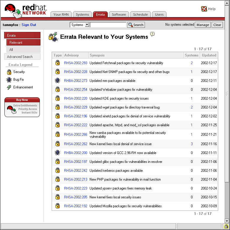 Red Hat Network is an Internet solution for managing one or more Red Hat Enterprise Linux systems. All Security Alerts, Bug Fix Alerts, and Enhancement Alerts (collectively known as Errata Alerts) can be downloaded directly from Red Hat using the Red Hat Update Agent standalone application or through the RHN website available at https://rhn.redhat.com/.