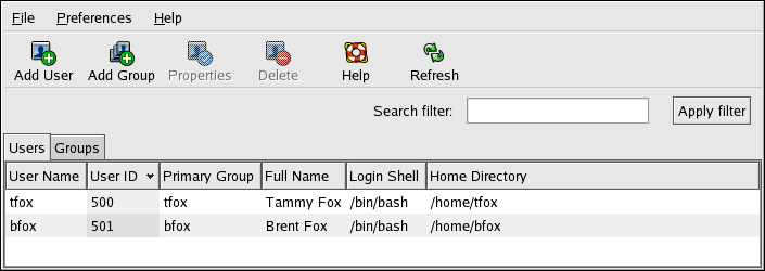 To use the User Manager, you must be running the X Window System, have root privileges, and have the system-config-users RPM package installed. To start the User Manager from the desktop, go to Applications (the main menu on the panel) => System Settings => Users & Groups. Or, type the command system-config-users at a shell prompt (for example, in an XTerm or a GNOME terminal).
