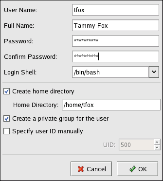 To specify a user ID for the user, select Specify user ID manually. If the option is not selected, the next available user ID starting with number 500 is assigned to the new user. Red Hat Enterprise Linux reserves user IDs below 500 for system users.