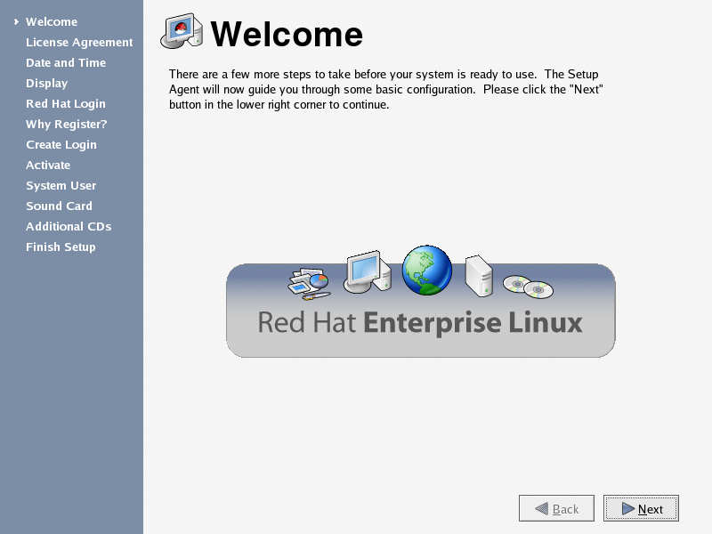 The first time you start your Red Hat Enterprise Linux system, the Setup Agent is presented. The Setup Agent guides you through the configuration of your Red Hat Enterprise Linux system. Using this tool, you can set your system time and date, add users to your system, install software, register your machine with the Red Hat Network, and more. Setup Agent allows you to configure your environment at the beginning, so that you can get started using your Red Hat Enterprise Linux system quickly.