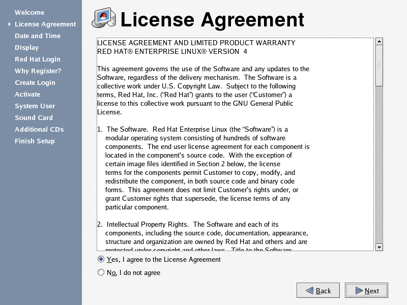You must agree to the License Agreement to continue using Red Hat Enterprise Linux. If you choose No, I do not agree at the License Agreement screen, the machine prompts you to either re-read the agreement or decline and shutdown your system. You cannot use Red Hat Enterprise Linux without first agreeing to the License Agreement.