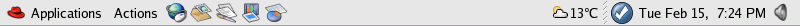 You may add more applets and launcher icons to either Panel in order to suit your needs. Right-click in an unused area of a Panel and select Add to Panel. This opens a window that allows you to choose either an applet or an application launcher. Clicking once on an icon navigates through the list of applications, and double-clicking adds an application to the panel. Figure 2-13 shows the Panel with the Weather Report added to show the current local weather and temperature.