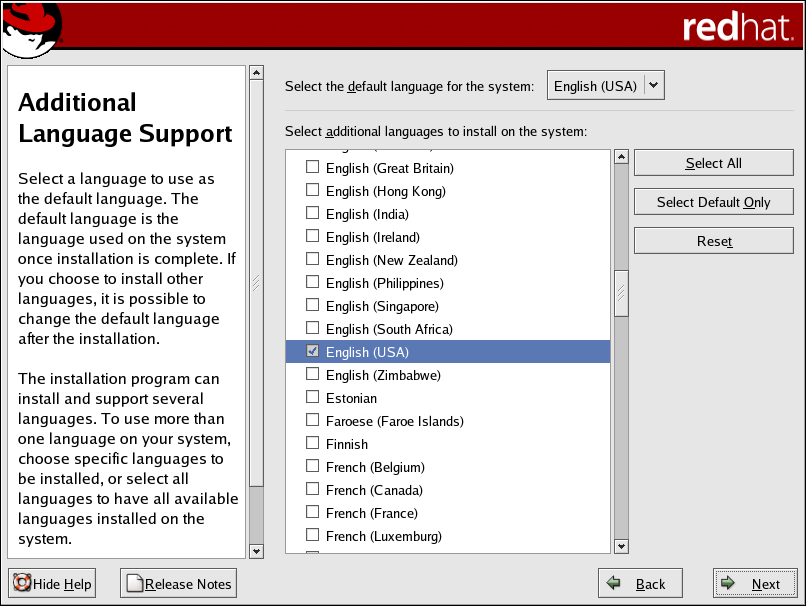 Use the Reset button to cancel your selections. Resetting reverts to the default; only the language you selected for use during the installation is installed.