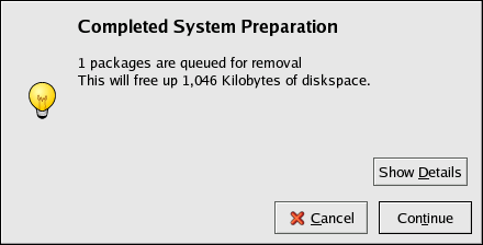 You can combine the installation and removal of packages by selecting package groups/packages to be installed/removed and then clicking Update. The Completed System Preparation window displays the number of packages to be installed and removed. |