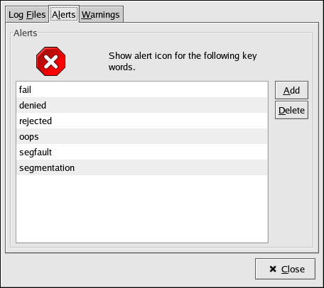 Log Viewer can be configured to display an alert icon beside lines that contain key alert words and a warning icon beside lines that contain key warning words.