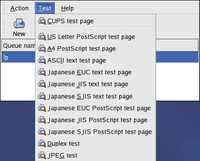 After you have configured your printer, you should print a test page to make sure the printer is functioning properly. To print a test page, select the printer that you want to try out from the printer list, then select the appropriate test page from the Test pulldown menu.