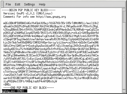 Open your exported public key file (such as mykey.asc, which was created in Section B.5 Exporting your Public Key) with a pager — for example, use the less mykey.asc command.