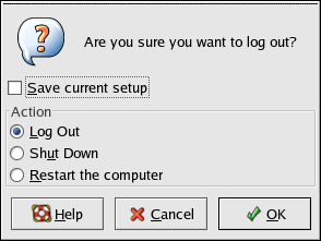 When the confirmation dialog appears as shown in Figure 1-19, select the Logout option and click the OK button. To save the configuration of your desktop, as well as any programs which are running, check the Save current setup option.
