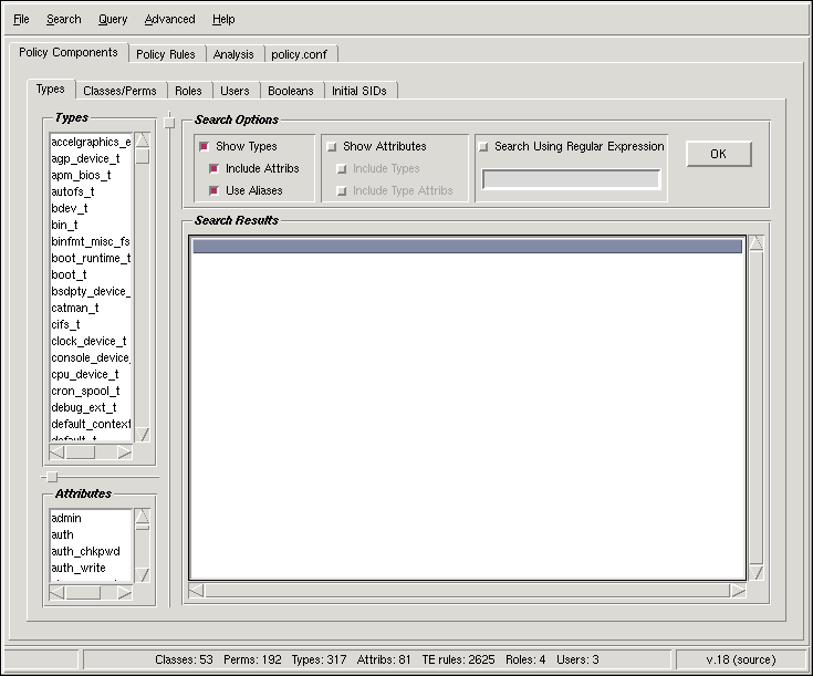 The search parameter tabs Types/Attributes and Classes/Permissions let you describe details about the source and target you are analyzing. An asterisk * appears on the tab if a parameter from that tab is set and affecting the search. You can define the source by using the exact type or using a regular expression. Automatically, the expression is anchored at both ends, so a caret ^ and dollar sign $ surround the search terms unless you explicitly change them.